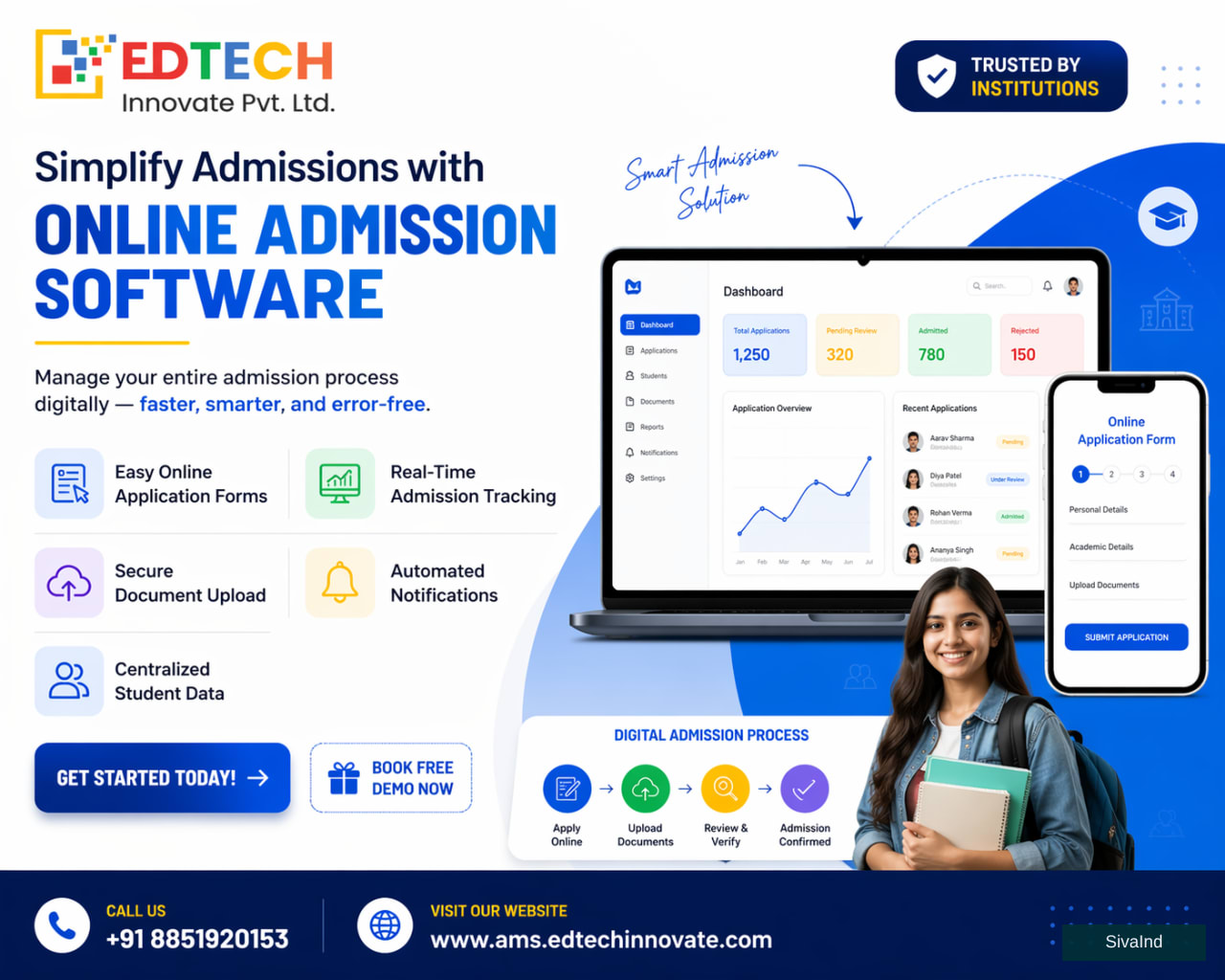 EdTech Innovate's online admission software provides educational institutions with a structured, end-to-end digital solution for managing student admissions. The platform handles application collection, document verification, status tracking, and communication — all within a single, secure system. It reduces administrative workload, eliminates manual data entry, and improves processing accuracy across departments. Schools, colleges, and universities rely on EdTech Innovate to streamline enrollment operations and maintain organized admission records. Contact EdTech Innovate today to learn how their online admission software can improve your institution's admission management process.