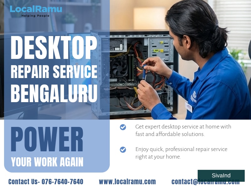 Don't ignore these signs. Your daily work and productivity depend on a properly working desktop for a seamless and smooth experience. In Bangalore, regular usage, power fluctuations, and dust buildup can affect your desktop's performance, leading to slow operation or complete failure. Why You Should call us? Slow performance or frequent hanging Overheating or unexpected shutdowns No display, boot failure, or BSOD errors Keyboard, mouse, or peripheral not responding Power supply or motherboard issues These issues can disrupt your work and may lead to bigger problems if ignored. Problems That We Fix: Desktop repair and maintenance Monitor, SMPS, and component replacement Software and hardware issue fixing RAM, SSD upgrade and desktop setup support Our Services: Service within 1 hour Skilled and verified technicians Affordable pricing with no hidden charges Trusted by homes and offices across Bangalore Book your desktop repair service today with LocalRamu and enjoy smooth performance every day. Call Now: 07676407640 Website: https://www.localramu.com/bengaluru/laptop Email:contact@localramu.com